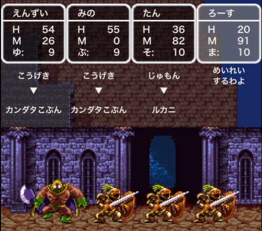 また、勇者1人で挑む場合はスクルトが無いので非常に大変です。ルカナンを掛けられると詰むのでカンダタ子分の魔法を封じ込めてからは攻撃と回復を交互に行い戦いましょう。その際、カンダタの攻撃力が高いのでホイミでは回復が追い付かないのでベホイミを覚えていないと勝つことはほぼ不可能です。